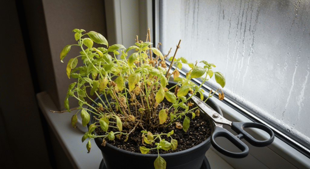 If you aren’t harvesting and it’s still unhappy, it’s likely an environmental issue. The most common winter killer for basil is cold drafts or wet feet. Move it away from the cold glass of the window (even a few inches helps) and make sure you aren’t watering it as much as you did in summer. Winter plants drink much less water.