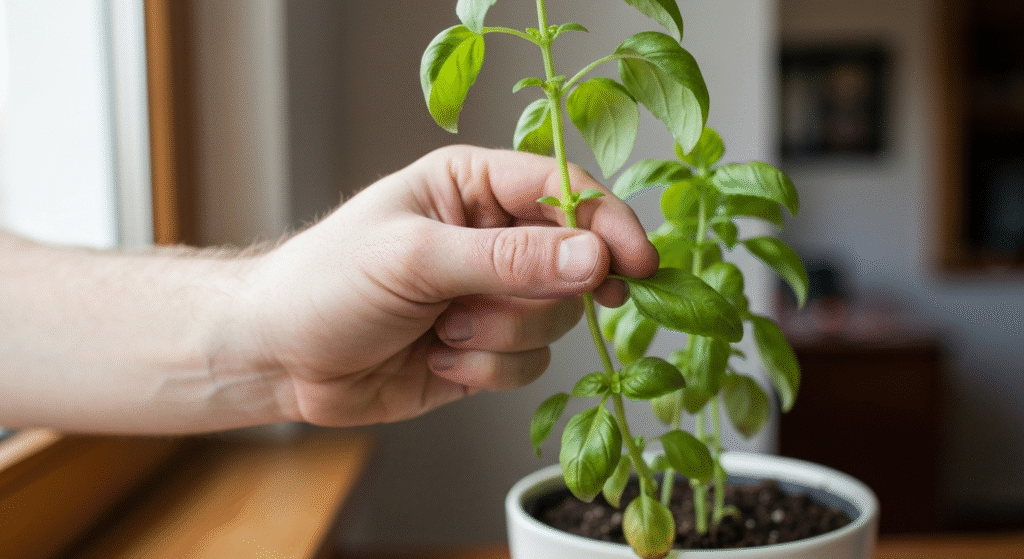 Basil is sneaky. Sometimes, instead of leaves, the tip will start to form a tight, cone-shaped cluster. This is a flower bud. If you see this, pinch it immediately!