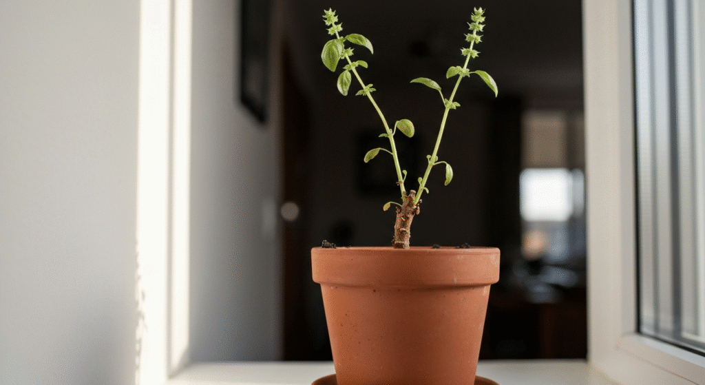 My early plants looked like palm trees—long bare trunks with a tiny tuft of green at the top. That is the result of plucking. To keep basil producing in a small container environment, you have to interrupt that vertical signal physically.