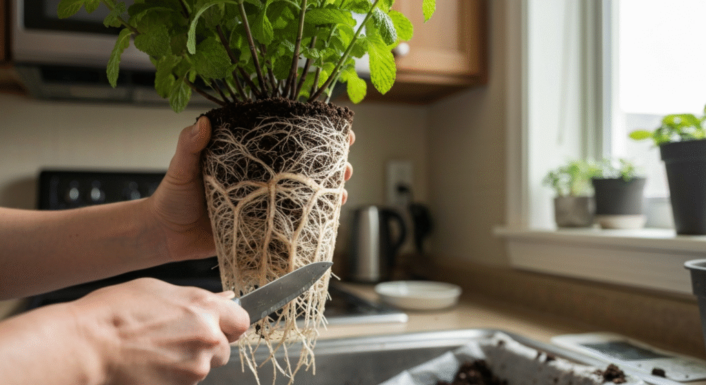 It feels brutal to cut away half of the plant’s roots, but mint is incredibly resilient. This mimics the natural die-back and regrowth it would experience in the wild. Within a few days, it bounces back with vigorous, leafy growth rather than leggy, woody stems.