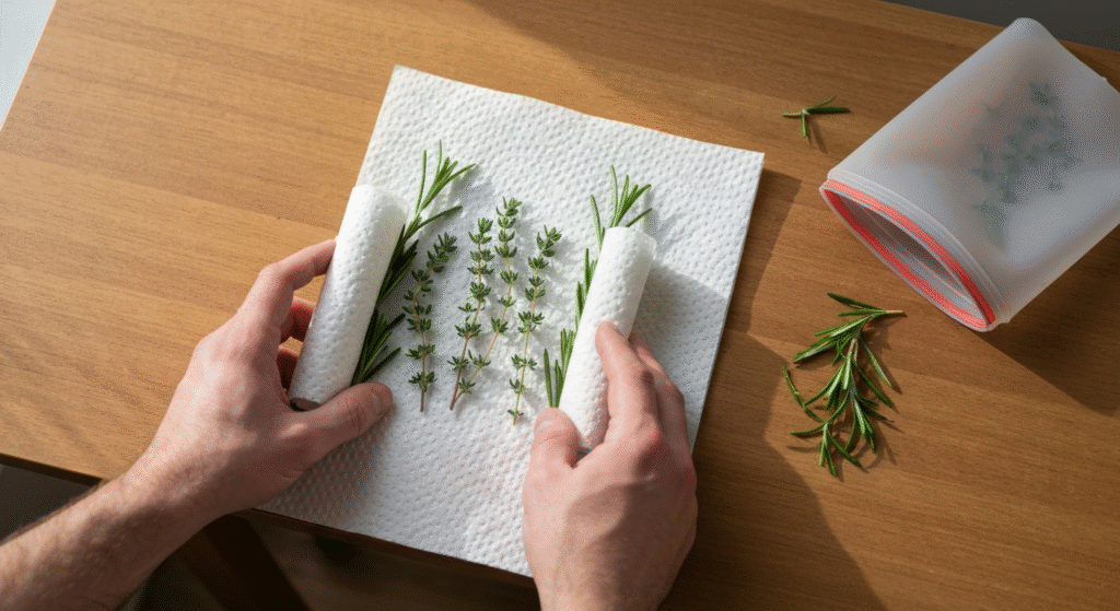 While the bouquet method works great for soft herbs, it is awkward for woody herbs or short sprigs. For Rosemary, Thyme, Oregano, Sage, and Chives, I use the “Paper Towel Roll” technique. These herbs generally have lower water content and are hardier, but they still dry out if left unprotected.